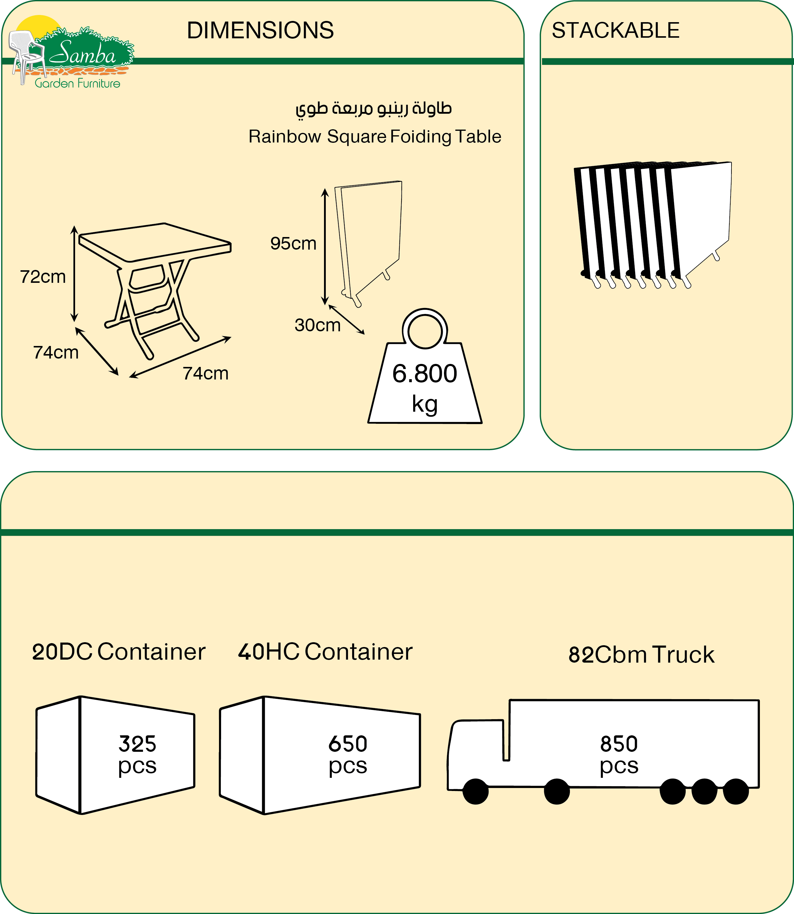 - سطح بلاستيكي مربع + أرجل ألومنيوم معالجة و قابلة للطي