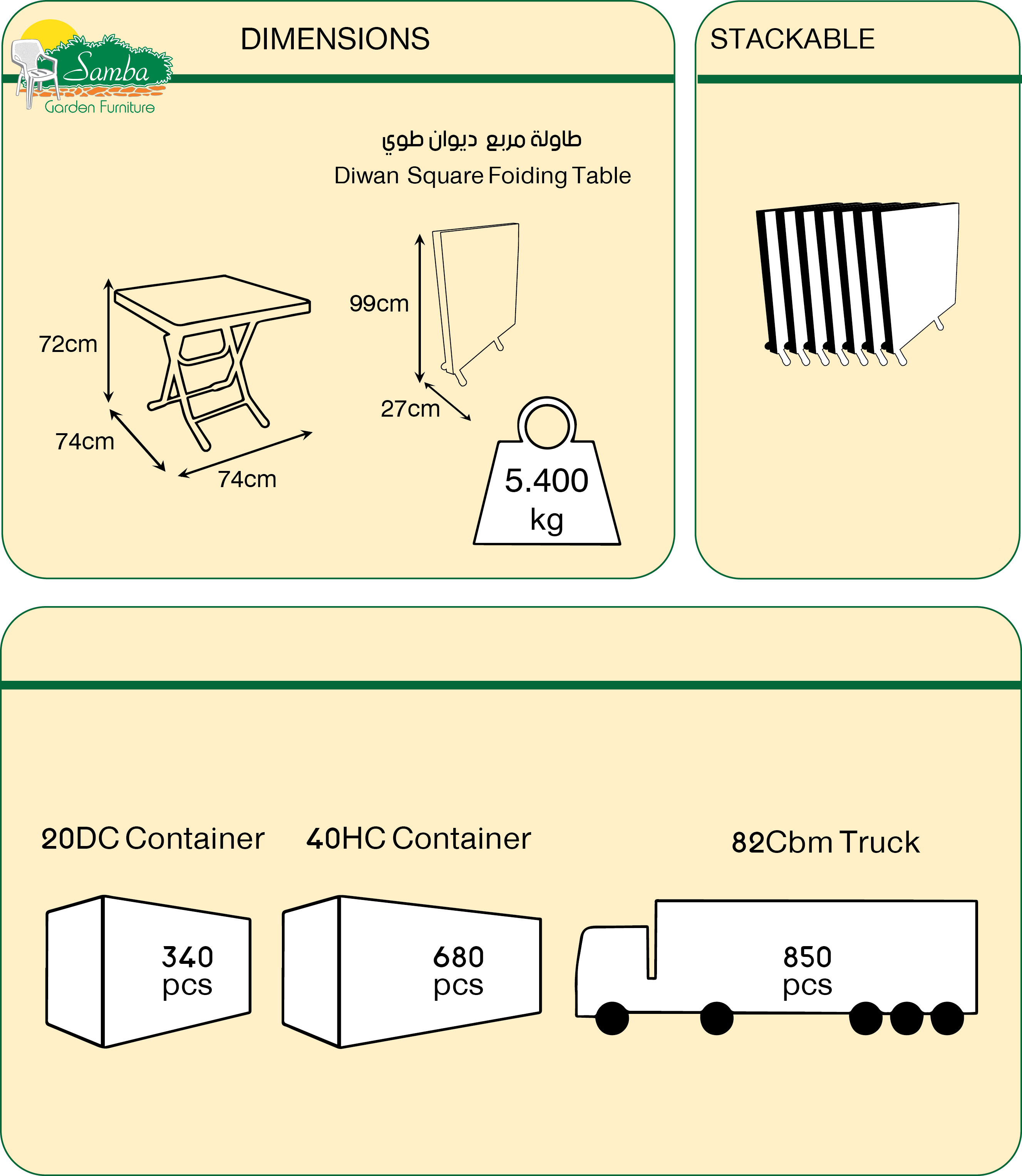 - سطح بلاستيكي مربع + أرجل ألومنيوم معالجة و قابلة للطي